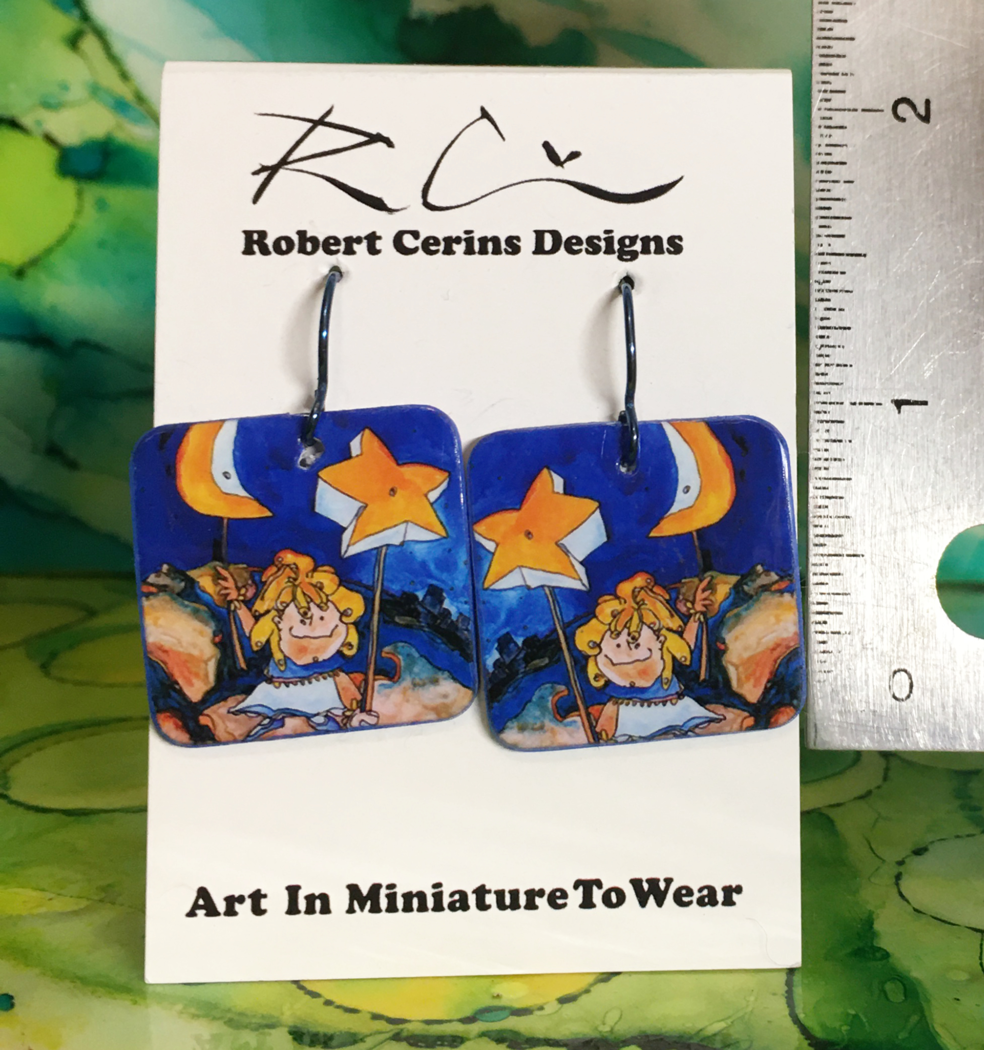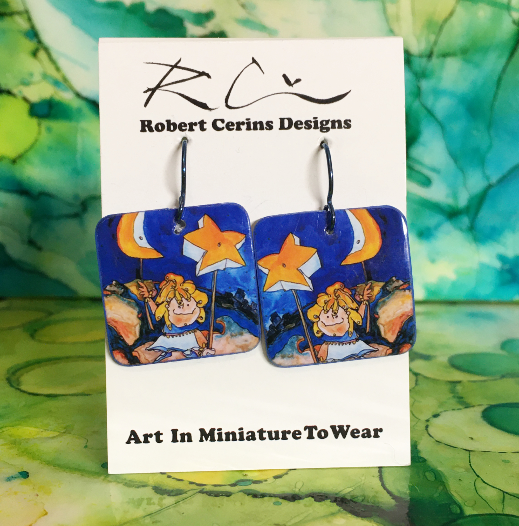 She’s Got Choices Earrings are lightweight, handmade, & hand-painted. These earrings are made of artist-quality watercolor papers laminated together. The top piece of paper is a high-quality print of an image Robert has painted, drawn or even photographed then glued to 100% cotton rag paper that is painted by hand.